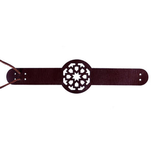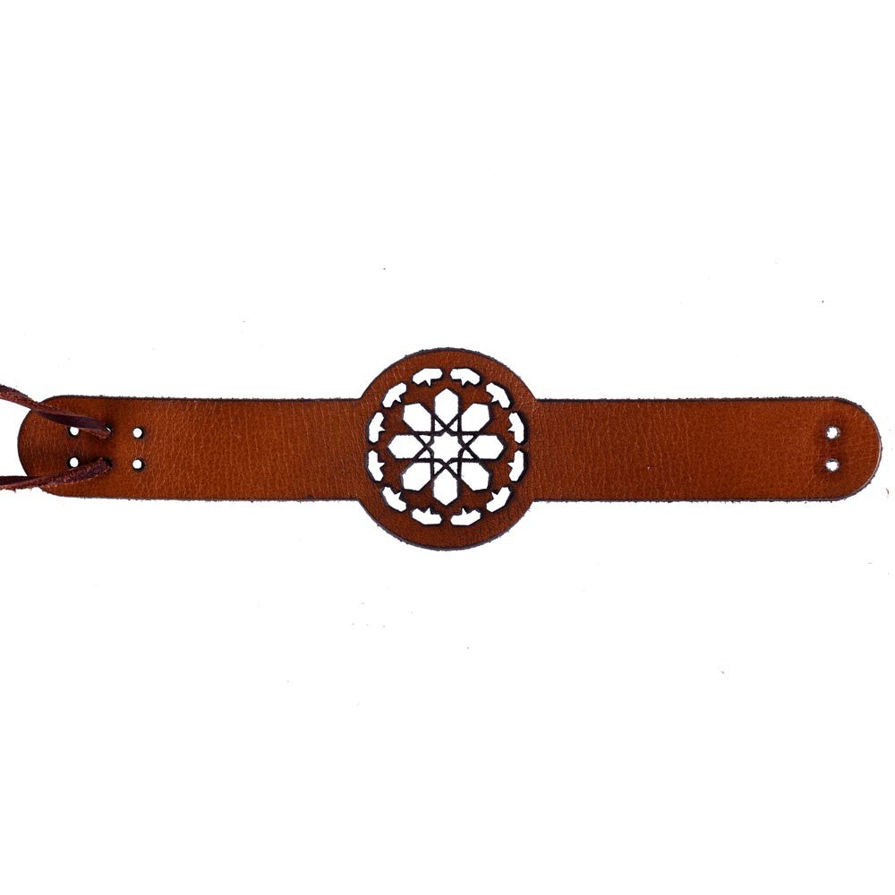 Pulsera de cuero diseñada y elaborada en Jaimaalkauzar. El centro de la pulsera presenta un diseño geométrico.