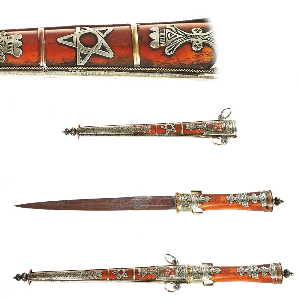 Puñal realizado artesanalmente en acabado deluxe con mango de hueso y alpaca con latón grabada.Dispone de anillas para colgarlo en cinturón.Producto recomendado por calidad y acabado.Medidas enfundado 45 cm largo.