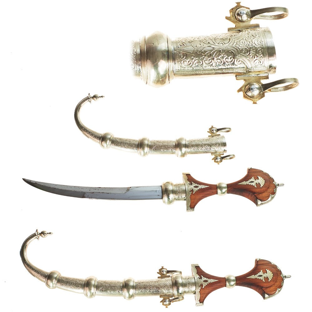 Puñal realizado artesanalmente en acabado deluxe con mango de madera y alpaca grabada.Dispone de anillas para colgarlo en cinturón.Producto recomendado por calidad y acabado.Medidas enfundado 45 cm largo.