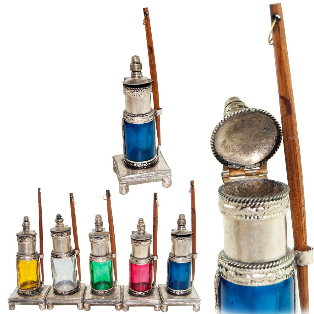 Recipiente de cristal y alpaca para kujul, colirio natural medicinal. Incluye palito de madera para su dosificación. No incluye el colirio. Disponible en varios colores: azul, verde, transparente, amarillo y rojo. Muy bonitos.