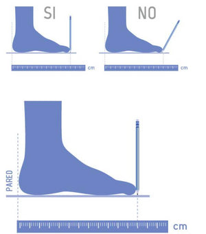 Toma la hoja y mide la distancia desde el borde de su dedo pulgar del pie hasta el talonmarque con un lápiz y midalo con un metro, compruebe los cm y escoja la talla que mas se adapte, si no esta su medida, escoja la medida siguiente.
