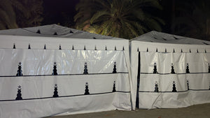 Las paredes son tipo cortina para abrir y cerrar fácilmente. También se pueden quitar o poner mediante una barra si se desea usar la Jaima Árabe como una carpa sin paredes y se cierran entre sí con cremallera.