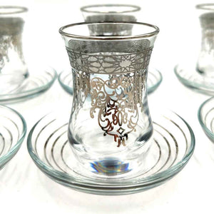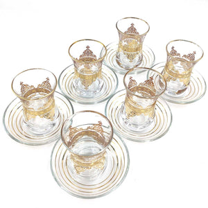 Set de 6 vasos de te turco con sus platitos. Realizados en cristal templado de gran calidad y decorado con diseños geométricos inspirados en al-Andalus.