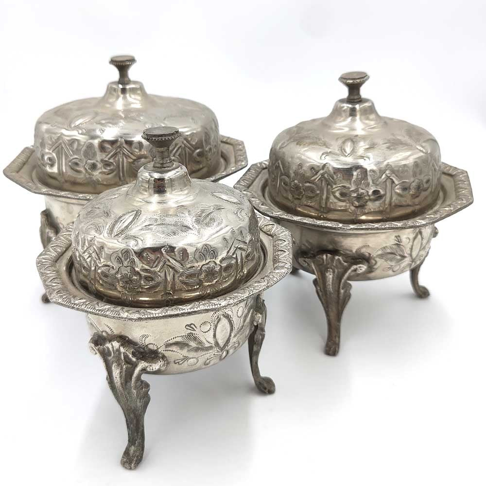 Set de 3 Piezas Bomboneras antiguas de alpaca realizadas y talladas a mano por maestros artesanos en Marruecos. PIEZA UNICA. Ideal para atrezo rodaje, pelicular, series ambientadas en el mundo árabe, marroquí.