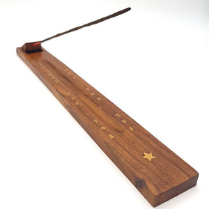 Tablilla de madera, incensario para varillas de incienso, ideal para quemar varitas de incienso. El agujerito donde se pone la varilla de incienso natural, se puede regular el angulo o escondender para que ocupe menos espacio y guardar en casi cualquier lugar. Decorado con motivos dorados incrustados en la madera.