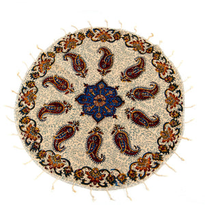 Tapete redondo de algodón 100% artesanal de 80 cm de diámetro, fabricado en Oriente Medio con tintes vegetales naturales. Sus exclusivos motivos florales pueden variar, haciendo de cada pieza una obra única.