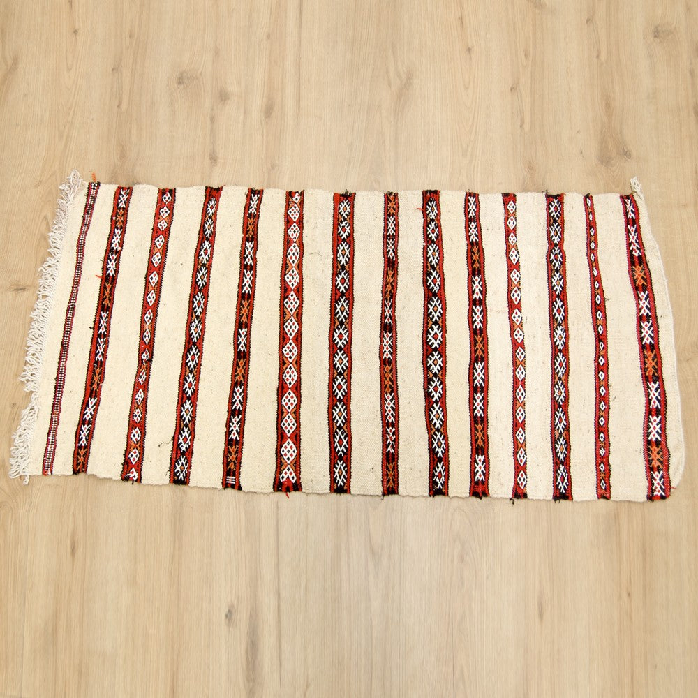 Tapiz Bereber, estilo vintage. Color fondo blanco. Decorados en color rojo, negro y naranja.