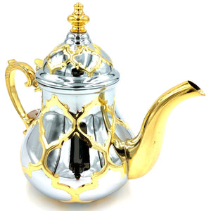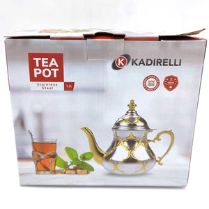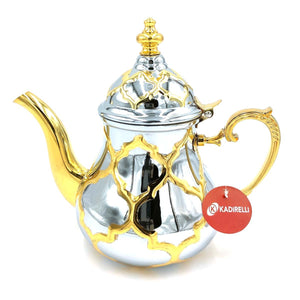 Tetera apta para cocina de inducción, para hacer y tomar te moruno o cualquier tipo de infusión o te. Realizada en Acero inoxidable con diseño morisco en colores plateado con detalles en Dorado.