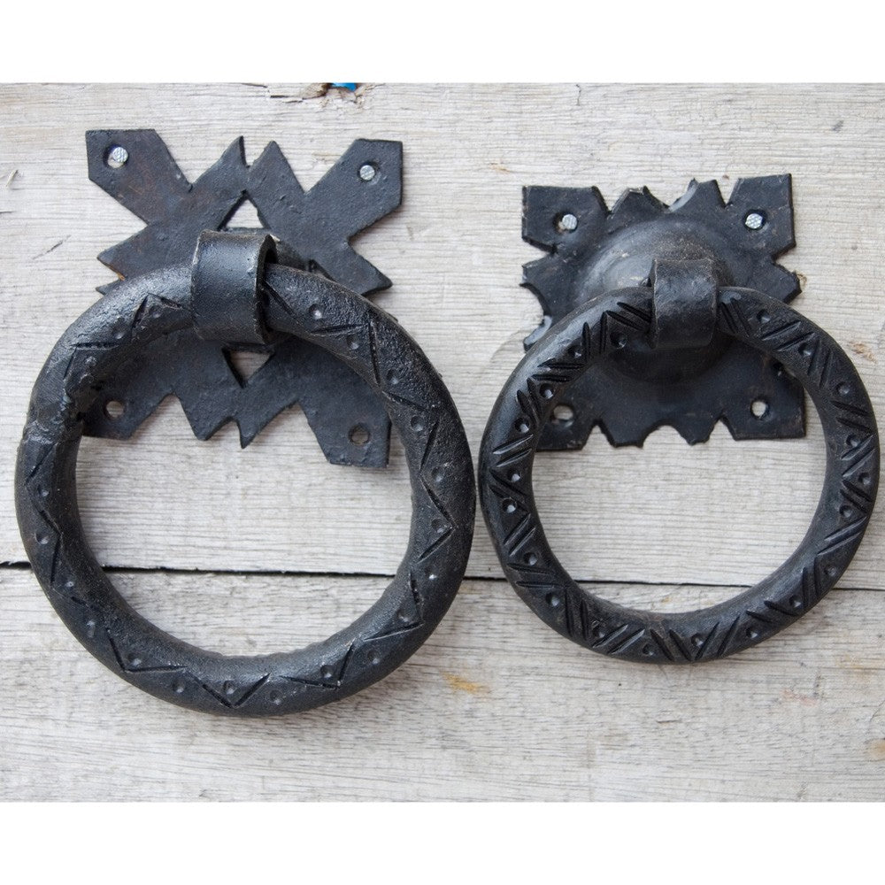 Tirador de forja redondo achatado con embellecedor en una sola pieza. Disponible en 2 tamaños.