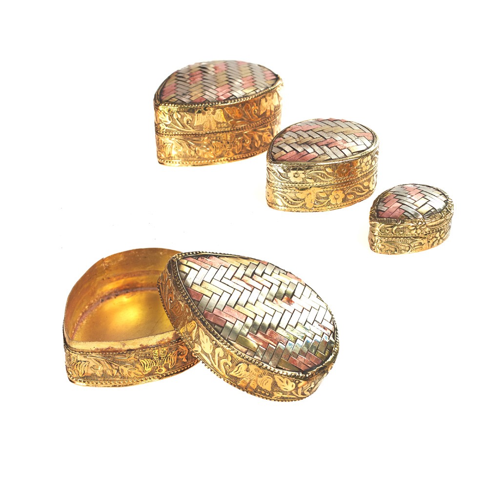 Set de tres cajas de bronce y alpaca trenzados entre sí.