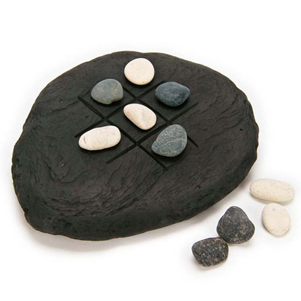 Clásico juego tres en raya. Realizado en una formato muy rústico. Las fichas son piedras naturales, y la base es una una fibra negra tipo rocosa. Realmente original. Medidas: 18 x 14 cm
