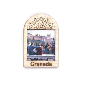 Souvenir ventanita árabe imán nevera con diseño geométrico inspirado en la Alhambra de Granada. El producto está elaborado en madera y decorado con celosía árabe andalusí. Varias fotos de Granada disponbiles, elija la que más le gusta en el menú desplegable.